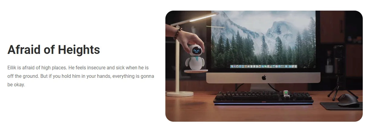 Eilik es sensible a las vibraciones. Se mareará si le golpeas la cabeza y se asustará si le das un golpe fuerte a la mesa. Así que, por favor, trátalo bien.